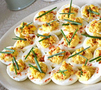 Egg white halves, filled with Smoked Salmon creamy egg mayo and topped with dill & prawns or creamy egg mayo with chopped ham, fresh parsley & capsicum or creamy egg mayo with Parsley Chives, Mayo & Radish.