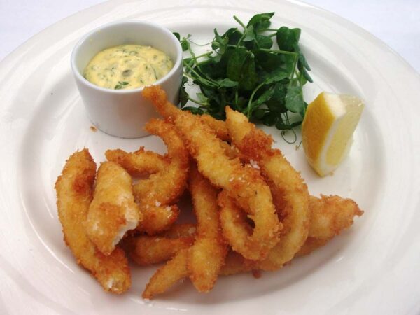 Fresh chicken breast cut in small slices/fingers, crumbed to perfection and freshly fried to order. Served with tomato ketch-up or lemon wedges.
