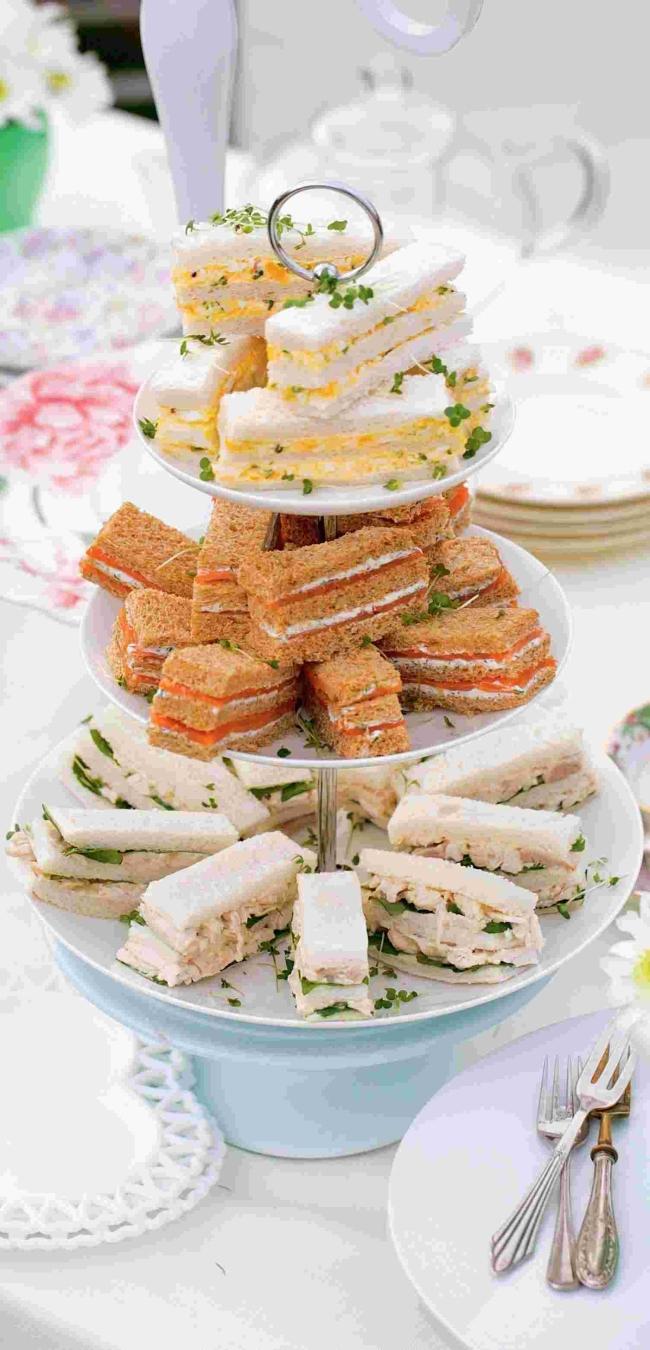 Served cut in triangle or rectangular shapes, with different fillings: ham & cheese, tuna mayo & cucumber, grated carrot, boiled egg, smoked salmon, cream cheese, chicken schnitzel, etc.