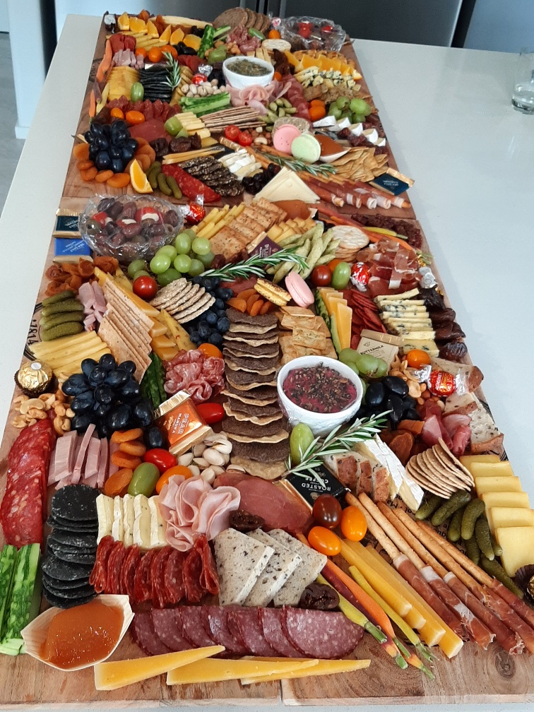 Ham, salami, cold meats, cheeses, olives, veggies, dips. Custom options available on request – please enquire.